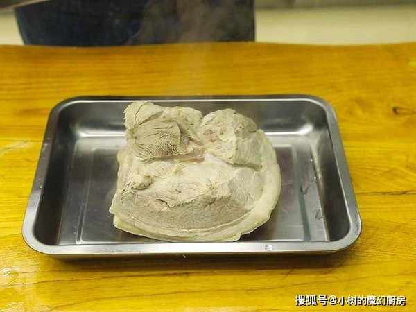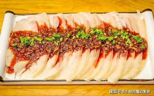 白肉能用筷子轻松地穿透并且没有血水冒出来,把它取出来用硬物把它压平,等到肉块定好型以后切成薄片,摆好盘后倒上蒜泥、香油和复合酱油,再撒上葱花即可。