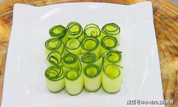 黄瓜从中间切开,用刮子把黄瓜一层一层薄薄地刮下来,放在盆里加入清水,然后把黄瓜片卷成小卷,摆放在盘子里。