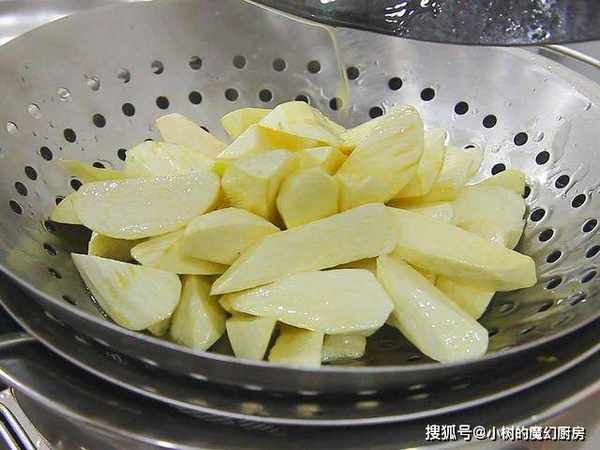 锅内烧油,油烧至5成热(微微冒烟时),放入茭白炸制大约30秒钟捞出茭白,控干油备用。