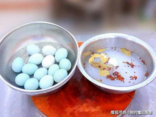 鸭蛋洗干净放在通风处晾干水分,准备半盆清水放入桂皮、香叶、花椒、八角,再倒入半包食盐。把调好的料水倒入锅中,大火烧开以后再熬制2分钟倒出来放凉备用。