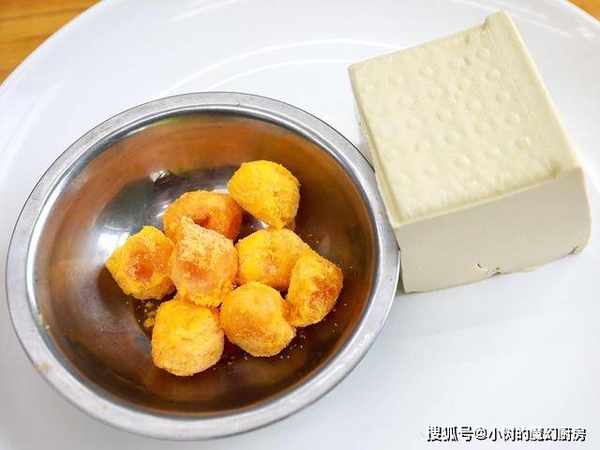 咸蛋黄放在锅中蒸10分钟,蒸好取出剁碎;嫩豆腐小方块,然后在开水锅中焯水煮2分钟,把豆腐倒出来控水备用。