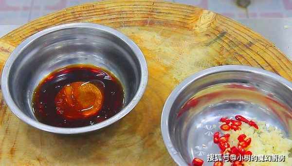 大蒜切成碎末,再切上几个小米椒和蒜沫,放在一个小盆里备用。