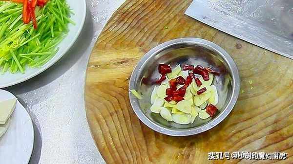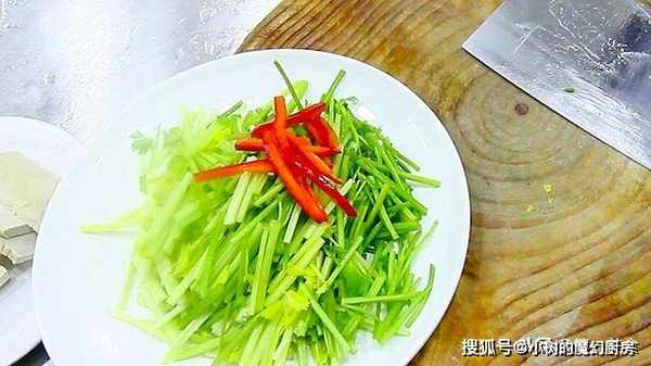 红椒半个切成丝,和芹菜放在一起,用来配色。