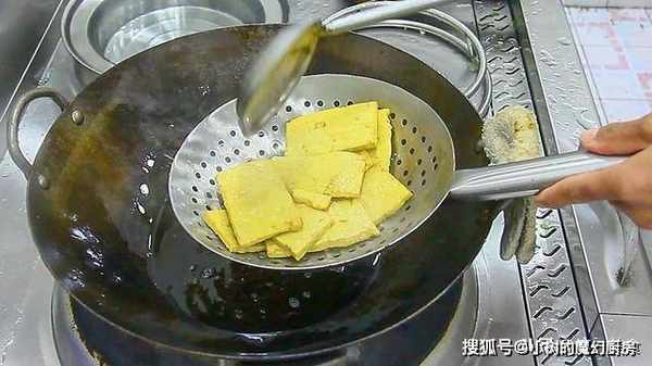 锅里倒入植物油,把油烧至五成热的时候,把切好的豆腐放入油锅里炸这个过程保持中火,豆腐会慢慢漂的起来。