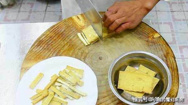 然后我们再把控干油的豆腐切成条,放在盘中备用。