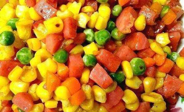 玉米粒,豌豆适量,胡萝卜半根,蒜3瓣,火腿肠1根