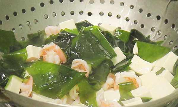 2.锅内烧水,冷水加入豆腐和海带焯煮1分钟去除腥味,水面冒烟时倒入虾仁,继续煮10秒钟捞出来,快速用清水冲凉,控干水分备用。