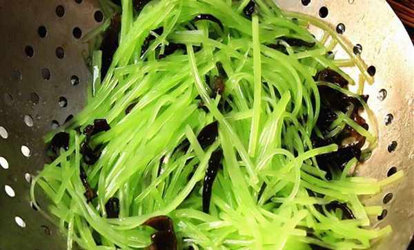 3.锅内烧水,加少许植物油保持鲜亮的色泽,水烧开后倒入木耳、莴笋快速焯水30秒钟,莴笋断生返青以后倒出来,用清开水冲洗降温,以免食材回软。