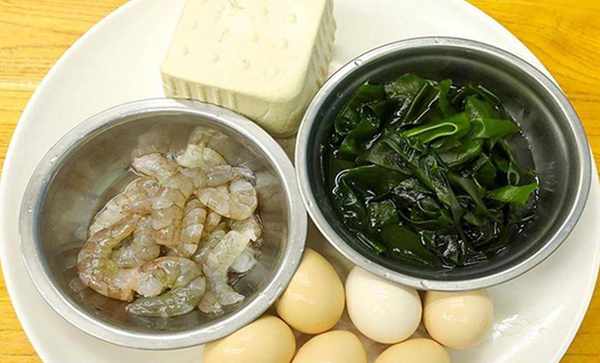 1.嫩豆腐切成小方块;鲜虾仁挑出虾线后清洗干净,控干水分;海带浸泡洗干净、切成小段,再准备几个鸡蛋备用。