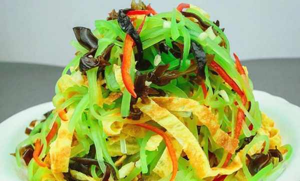 4.准备一个大盆,倒入蒜末,加入食盐2克,味精1克,白糖少许,白醋5克,香油5克,倒入准备好的木耳、莴笋颠盆拌匀,再倒入鸡蛋丝,继续拌匀以后即可装盘食用。