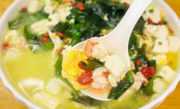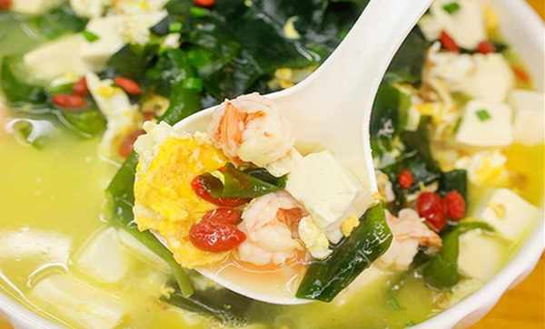 3.锅内烧油,把鸡蛋打进去,煎成溏心荷包蛋后打散,然后倒入适量的清水,放入海带、豆腐,加入食盐、胡椒粉调味,大火煮2分钟即可,最后撒上枸杞点、美味即成。