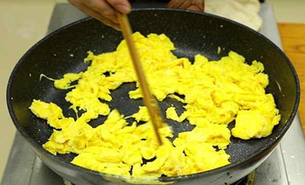 2.锅里烧油,把蛋液倒进去煎一下,小火煎、大火煎出来的鸡蛋容易老,鸡蛋全部定型以后再翻几下就熟了,倒出来备用。