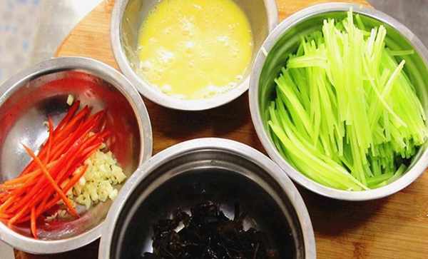 1.莴笋一根,切成细丝。盆中打入一个鸡蛋,加入少许水淀粉搅拌打散。泡发的木耳一小把、切成丝,大蒜几粒、拍散以后剁成蒜末,红椒一片切成细丝用来配色。
