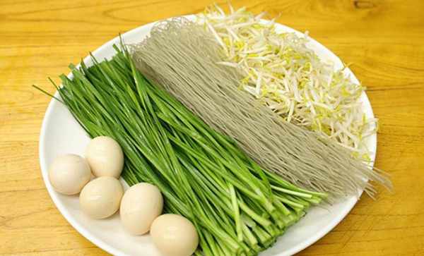 1.粉条开水烫软,加入料油、酱油拌匀,这样既不粘连,炒出来还酱香浓郁、颜色好看;一把韭菜洗干净、切成段;半个红椒切成丝,用来搭配颜色;绿豆芽淘洗干净放在盆中;几个鸡蛋打入碗中,加入少许食盐,搅拌打散成蛋液;再切点五花肉片备用。