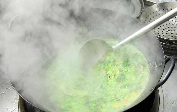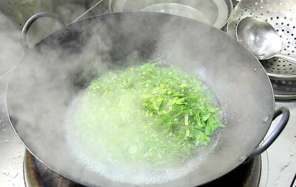 2.锅内加入少许植物油,一勺食盐,淡盐水能使煮出来的芥菜颜色更加鲜亮,植物油能在芥兰表面形成油膜,防止里面的营养流失,水烧开以后把芥菜倒入锅中,快速焯水20秒钟,把芥菜倒出来用凉水冲洗几下,以免芥菜回软。