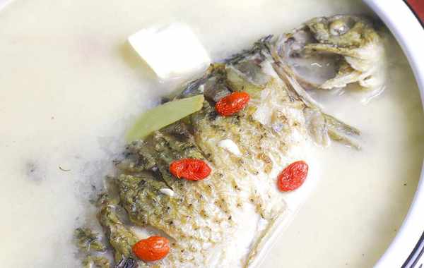 5.15分钟以后打开锅盖,把锅边的浮沫撇干净,放入豆腐,盖上锅盖再炖3分钟,把豆腐中的营养炖出来,这样鱼汤会更加浓香。