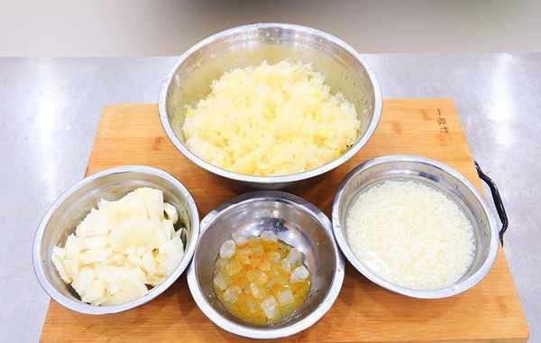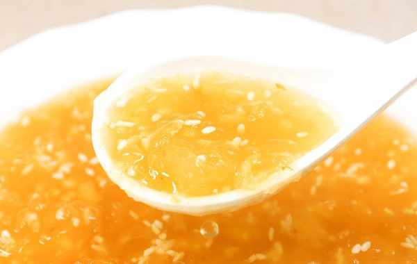 2.准备一个雪梨,去除梨核切成片;冰糖30克 放入碗中,再加入适量的桂花酱,雪梨和桂花炖出来的汤羹更加温润清香;再准备适量的米酒备用。