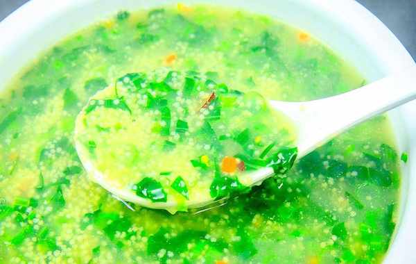 4.熬制期间,把锅中的浮沫打干净,这样煮出来的小米羹会更加的晶莹清澈,大约熬制3分钟,小米开花以后把芥菜倒入锅中搅拌均匀,继续煮至小米羹微微烧开,勾入半勺芡粉,把小米羹调得稠一点,以免过于寡淡,小米羹再次煮开后即可出锅,美味即成。