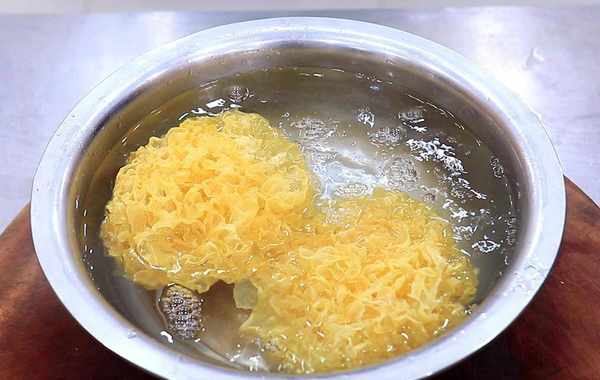 1.把银耳用凉水浸泡1个小时,泡发以后去除黄色的硬根,再剪成小块,银耳一定要用凉水泡发,口感才会清脆,用热水泡出来比较绵软,而且不容易出胶。