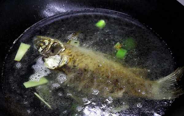 4.锅中加一些猪油炒化,放入葱花和姜片爆香,放入煎好的鲫鱼,沿锅边淋入适量的清水没过鱼身,盖上锅盖,开大火炖煮15分钟。