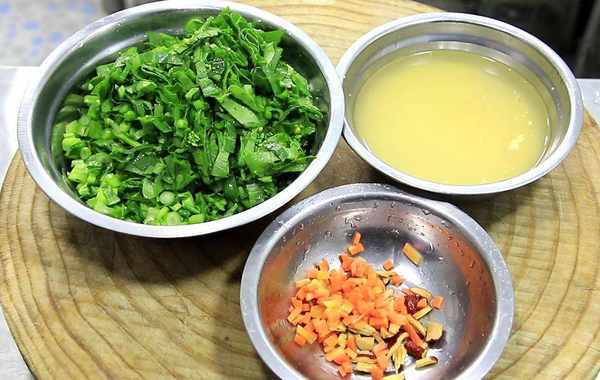 1.准备鲜嫩的芥菜一小把,切成碎末;准备一把小米放入清水中,抓洗干净以后浸泡10分钟,把小米泡开更容易煮熟;再切一点红枣粒,增加小米羹的营养;胡萝卜一小块切成丁,用来配色。