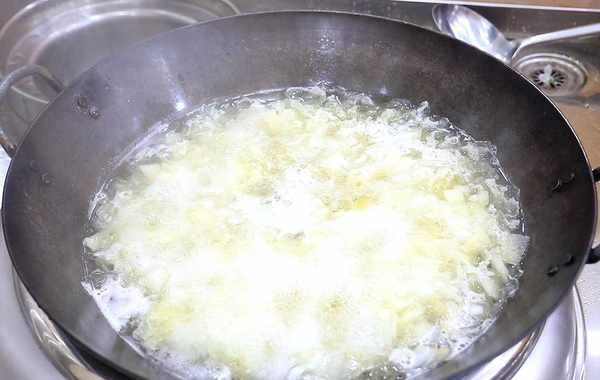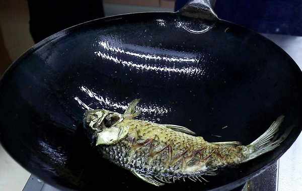 3.煎鱼的时候要先滑锅,防止鱼皮粘锅破损,滑好锅以后倒出热油加入凉油,再撒一些食盐,同样是为了防止粘锅,把鲫鱼放入锅中,开小火慢慢煎,一面煎好以后翻过来煎另一面,把鱼煎至两面金黄,倒出来备用。