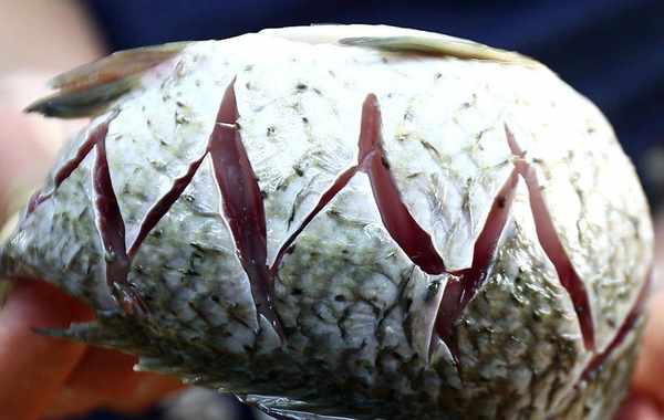 1.准备一条鲫鱼,刮去鱼鳞、去除内脏、鱼鳃,把鱼身冲洗干净,在鱼身两面都打上一字连刀,方便煮熟和入味。