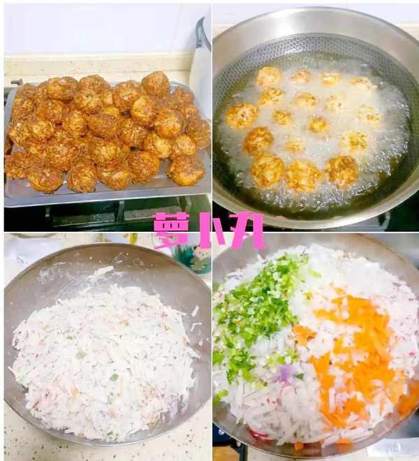 炸丸子是小时候最美味的回忆,腊月里农闲时,大人才有心情做好吃的。萝卜是自己地里种的,洗净切丝剁碎,加盐,面粉,姜葱末,用筷子把食材和调料搅拌均匀,可以团成丸子就行了。