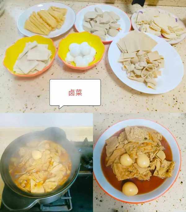 卤菜可以卤荤菜也可以是素菜,我喜欢卤豆制品。还可以加鹌鹑蛋,海带结等。首先将豆制品改刀成自己喜欢的形状;接着把豆瓣酱炒下,倒入适量的水,将花椒大料、桂皮、香叶、干辣椒、老抽,生抽放入锅中,煮出料香;再把豆制品放入,随后放入冰糖、盐、小火熬制15分钟关火,先别装出来,多焖会更入味。