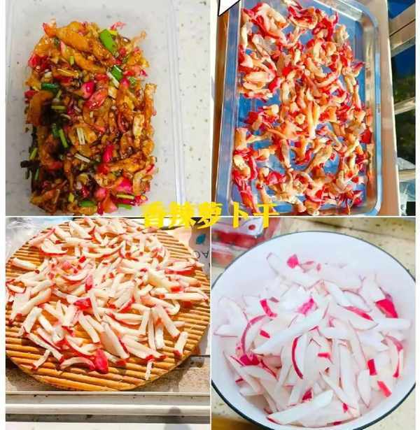 香辣萝卜干,是喝粥的最佳搭档。没有它,这碗粥下肚太寡味。以前都是亲朋送的萝卜干,最近在头条上看友做了这个,于是也蠢蠢欲动,买几个萝卜回来练手。红脆的大萝卜才八毛一斤,即使失手感觉也不会心疼。切条,盐腌,晾晒,加各种料调制,咯嘣脆,咸鲜。美中不足的是酱油放多了,颜色不够纯正。