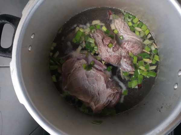 正式的烹饪过程分为两个步骤,第一步骤主要是先用高压锅将牛腱肉筋软化、烂化的过程。首先把整块牛腱肉粗切分为两部分,放入高压锅中,清水浸漫过肉数公分,将葱、姜细细切碎连同八角一起放入锅中。阿春问是否放蒜,爹爹说此时不放蒜,要倒些黄酒,阿春还又放入半个柠檬。盖上旋紧锅盖,高压锅烹饪半个小时,第一步骤结束。