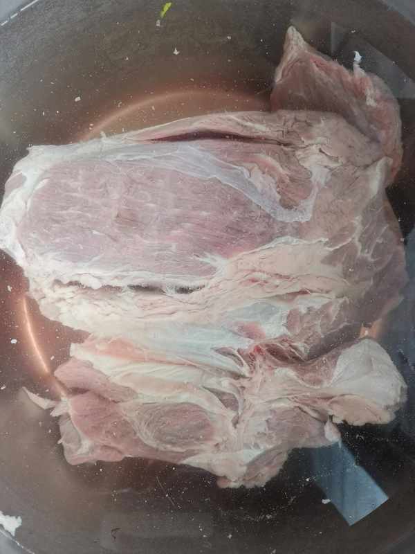 阿春这道菜主材是两斤整牛腱,选用的是澳大利亚安格斯黑牛牛腱。牛肉分牛腱、牛腩、牛肩、牛脑、牛霖、西冷、菲力等等,其中阿春最青睐牛腱。牛腱肉不同于梅花肉的肥瘦相间,牛腱肉没有肥油 ,一层肉,一层筋,属于肉筋相间。牛腱肉的筋又不同于牛腩的筋膜,牛腱的筋没有筋筋拽拽的膜,属于真材实料的牛韧带。因此阿春认为牛腱肉的口感最为舒爽。牛腱分前腱、后腱、圆腱、扁腱、金钱腱…这里阿春不做要求,只要求是同一条黑牛同一条腿上的一整块牛腱就可。起初阿春的牛腱都是购自盒马的冷鲜安格斯黑牛腱,后来发现京东一号店的安格斯黑牛腱也具有盒马食材同样水准,价格还便宜几元钱,因此这两处是阿春这道私家美味的食材来源地。