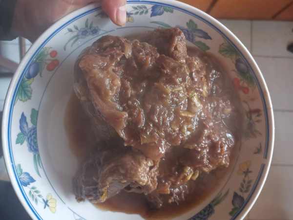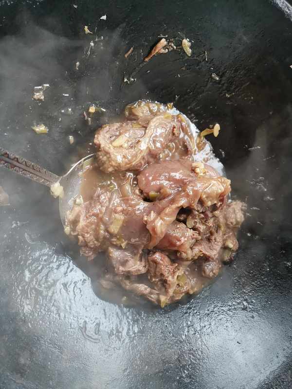 第二步骤要换铁锅,这一步骤主要是牛腱肉的收卤入味过程。将牛键肉从高压锅里慢慢捞出放在铁锅里,此时方将细细切碎的蒜放在铁锅底,将高压锅里的汤汁尽数倒入铁锅,先开大火,倒入酱油、陈醋,加些红糖,爹爹告诉阿春要烧到将汤水、卤汁收尽为止,要时刻注意不能沾锅。阿春时刻留意火候,火苗逐渐开小,期间不时翻一下肉身,大概又将近半小时,卤水渐渐收进肉中,大功告成。