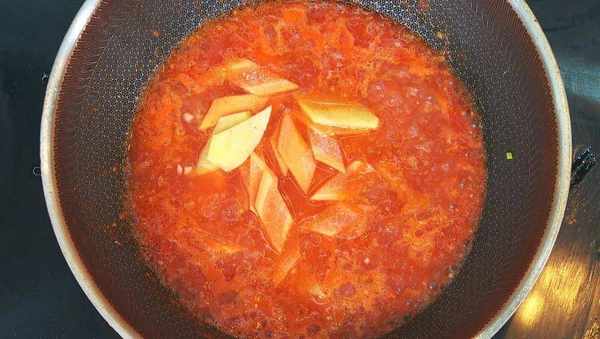 3、锅中倒油,放入葱姜蒜爆锅,放入去皮切碎的西红柿和番茄酱,小火炒出沙,加一点面粉增稠,加入水炖煮3分钟。