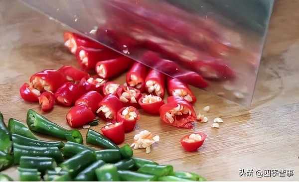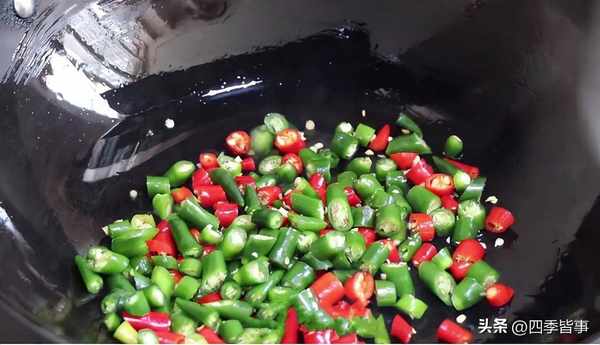 4、起锅烧热,下青红椒炒出香味,加少许盐增加底味,把辣椒水分炒干后盛出备用。