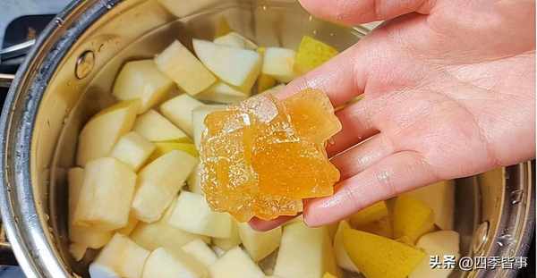 3、准备一个汤锅或者砂锅,清洗干净,放入切好的梨,加入适量清水。