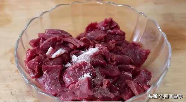 1、大块牛肉改刀切成薄片,将切好的牛肉放入一个干净的大碗中,接着给它调味腌制,碗中加入调料抓拌均匀,抓匀后腌制10分钟。
