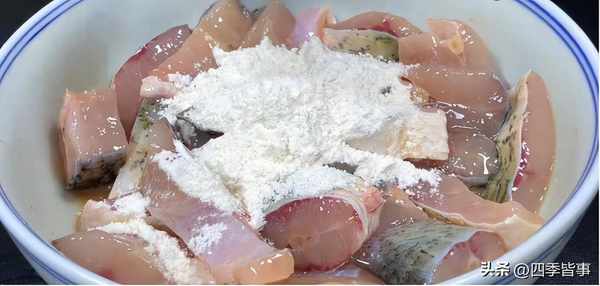 3、把腌好的鱼肉挑出来放入另一个碗中,原来的葱姜蒜不要了,接着打入一个鸡蛋,让鱼肉均匀裹上鸡蛋液,加入一大勺面粉,一勺玉米淀粉继续搅拌均匀,干的话可加少许清水。