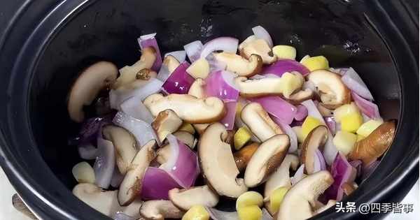 6、砂锅烧热,少许食用油,油热加入姜蒜粒和洋葱块,小火翻炒,炒香后加入香菇。
