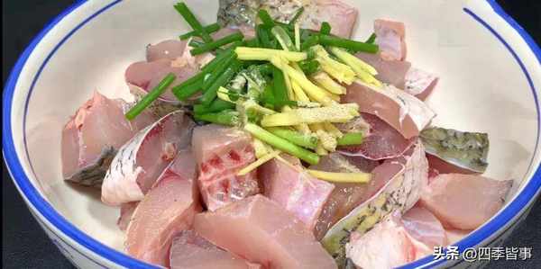 1、草鱼洗净切成均匀的小段,装入大碗中,加入切好的姜丝,葱段,加少许食盐入底味抓拌均匀,让鱼肉充分吸收料汁,腌制20分钟。