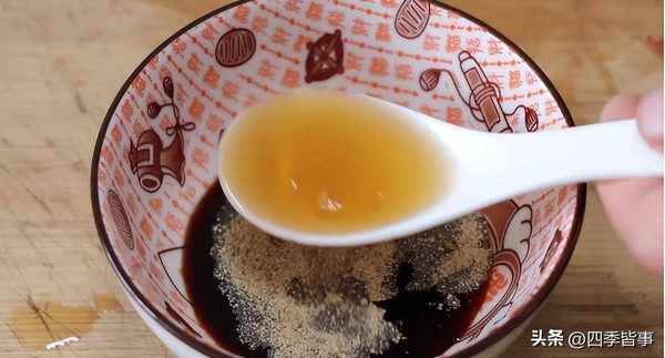 2、调一碗料汁,碗里加入两勺生抽,一勺蚝油,一小勺食盐,一勺料酒,一小勺胡椒粉,搅拌融化后放一旁备用。