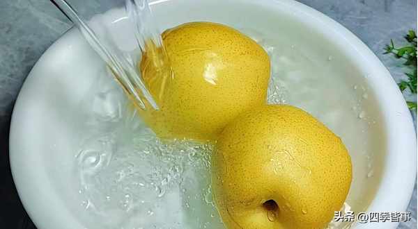 1、准备两个雪梨,梨表面有一层蜡,用盐反复搓洗干净,浸泡10分钟更好。