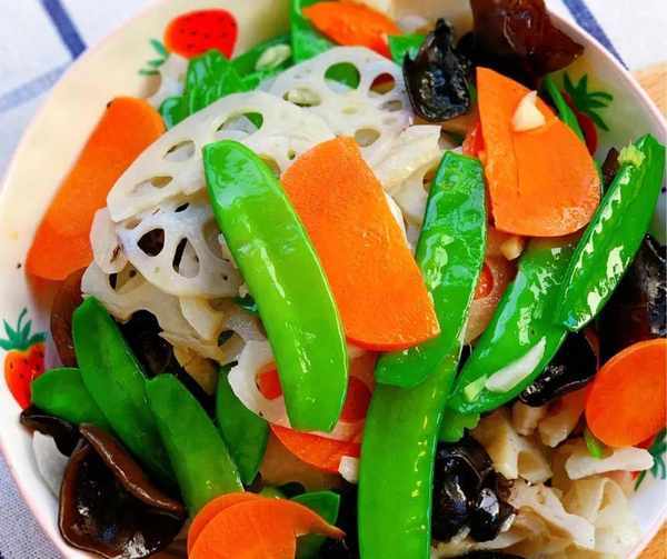 食材:莲藕、荷兰豆、胡萝卜、核桃仁少量、黑木耳、蒜