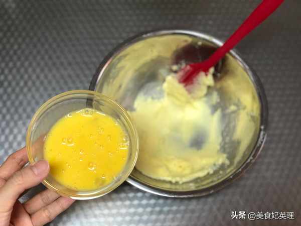2.分三次加入全蛋液,每一次都要搅拌均匀以后再加入下一次