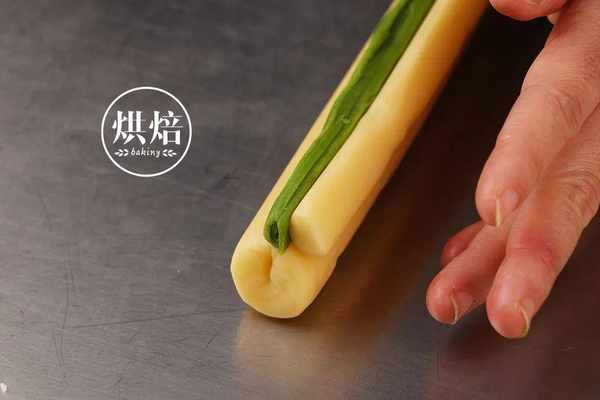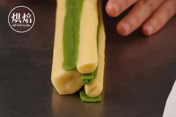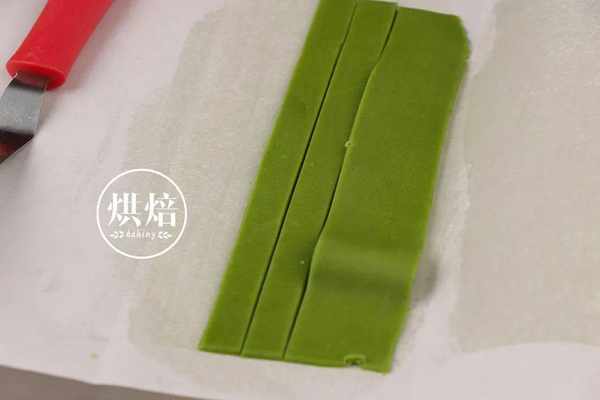 ⑫开始组合了!将小的抹茶方形拿出来用刮板裁成五条长条面团。