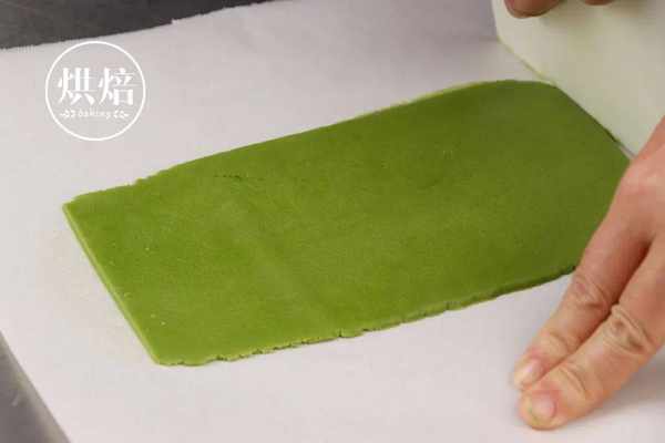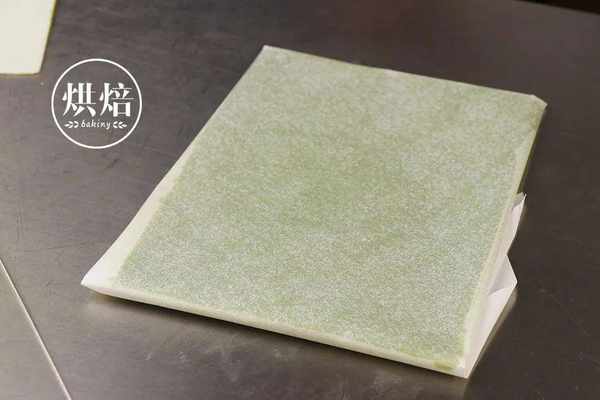 ⑩将大的抹茶面团上下垫上烘焙纸,擀成厚薄均匀的方形,20cm*15cm。如果擀不方的话,可以裁成方形,最后放入冰箱冷冻10-15分钟定型。