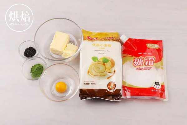 舒可曼低筋面粉 150g/舒可曼糖粉 70g/无盐黄油 100g/蛋黄 1个/抹茶粉 3g/黑芝麻 适量