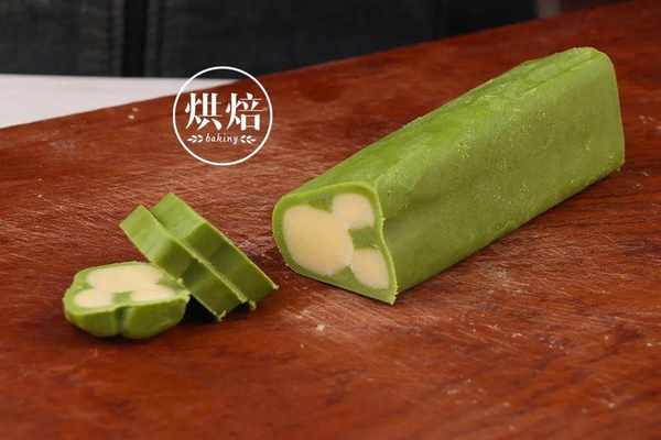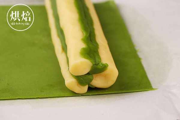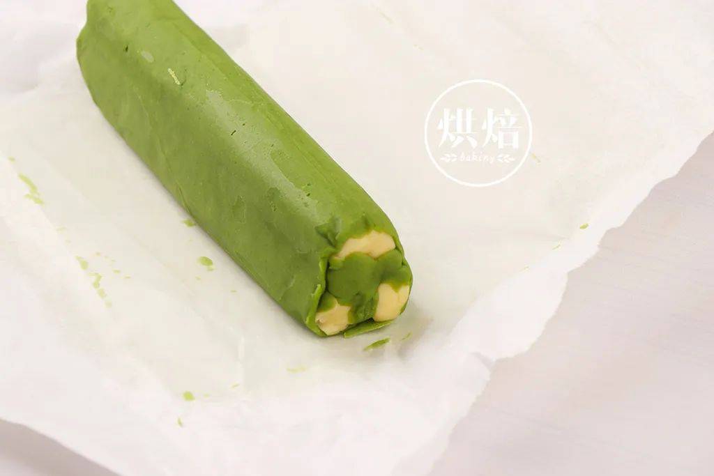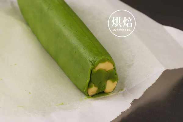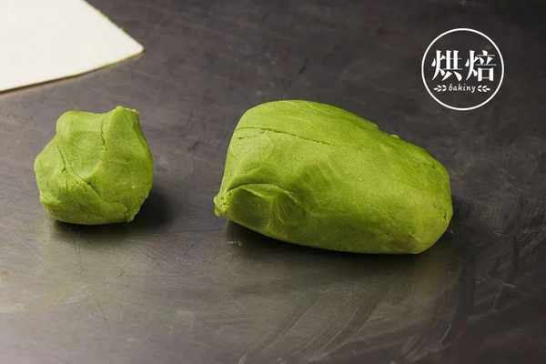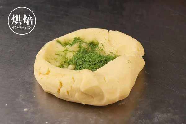 ⑧在另一份原色面团中加入3克抹茶粉,混合均匀,成为一个抹茶面团。