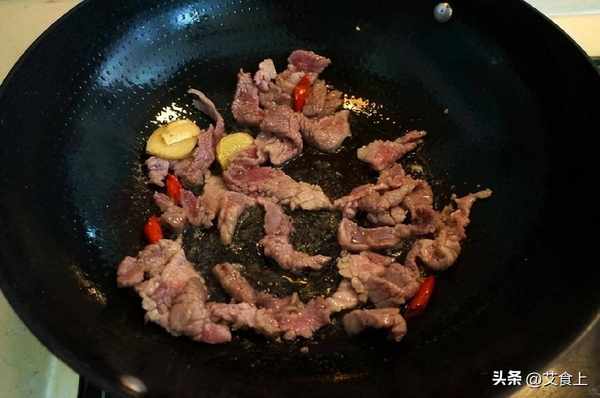 5.炒锅中倒适量油,先将姜片、小米椒煸炒几下,然后入肉片;