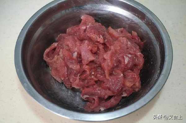 2.牛肉切薄片,用一小勺淀粉、少许盐、少许清水混合均匀,腌10分钟;